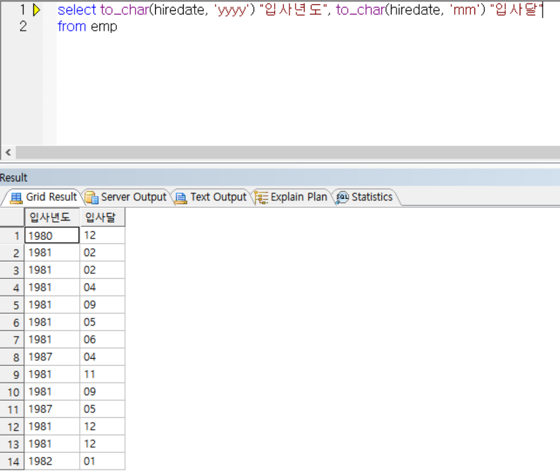 select to_char(hiredate, 'yyyy') "입사년도", to_char(hiredate, 'mm') "입사달"