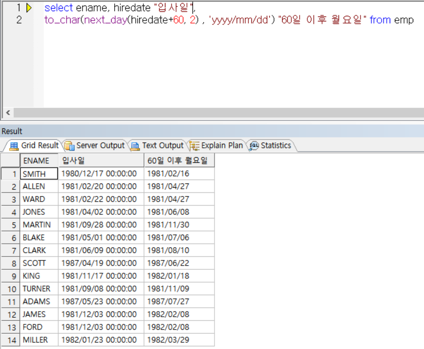 to_char(next_day(hiredate+60, 2) , 'yyyy/mm/dd') "60일 이후 월요일" from emp