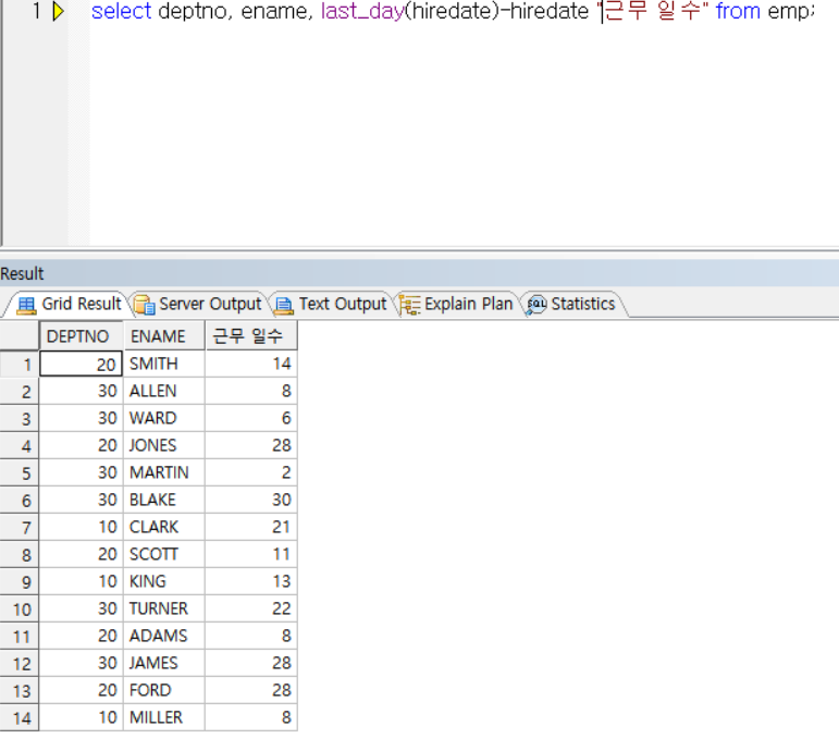 select deptno, ename, last_day(hiredate)-hiredate "근무 일수" from emp;
