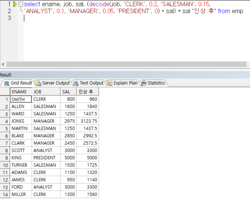 'ANALYST', 0.1, 'MANAGER', 0.05, 'PRESIDENT', 0) * sal) + sal "인상 후" from emp