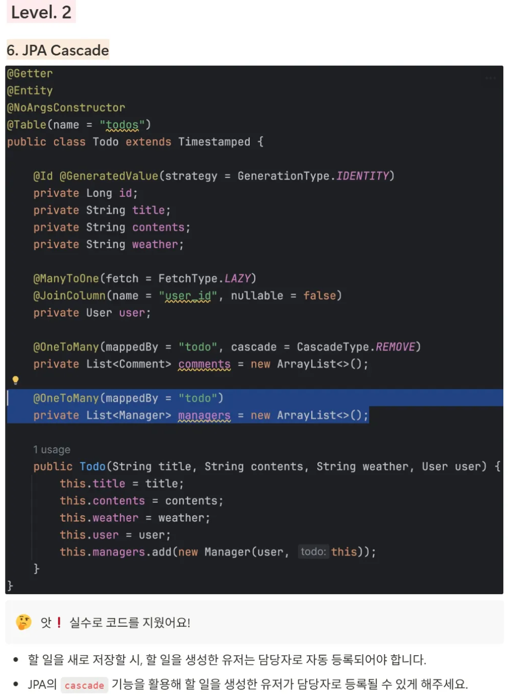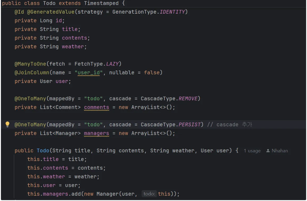 즉, 부모 엔티티(Todo)를 저장할 때(영속화할 때), 연관된 자식 엔티티(Manager)도 자동으로 함께 저장된다.