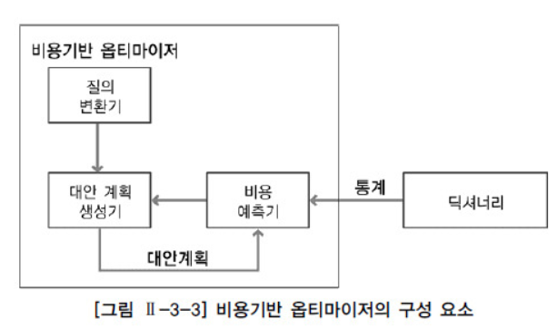 테이블 및 인덱스 등의 통계 정보(Data Dictionary/시스템 통계정보)를 활용하여 SQL문을 실행하는데 소요될 처리시간 및 CPU, I/O 자원량 등을 계산하여 가장 최소비용으로 효율적일 것으로 예상되는 실행계획을 선택하는 옵티마이저