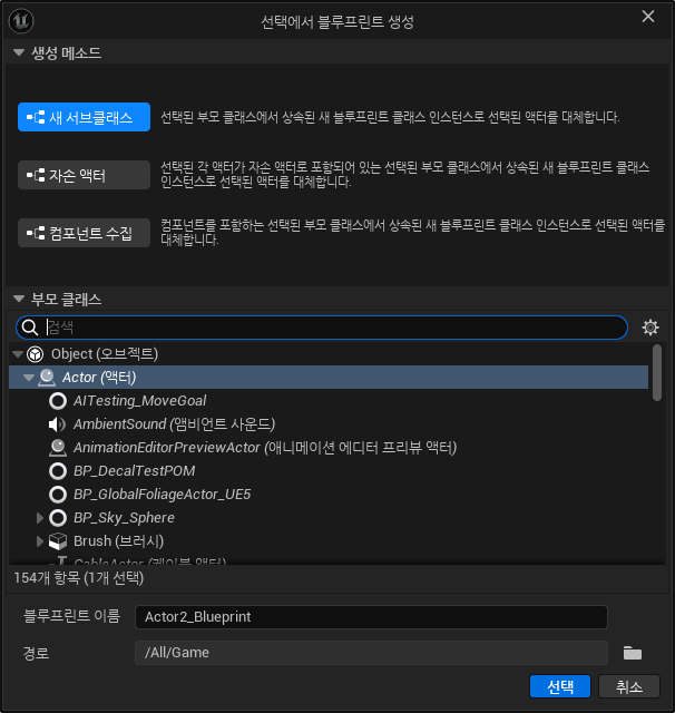 ✔ 선택한 부모 클래스를 상속하는 새로운 블루프린트 클래스를 생성