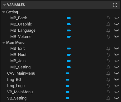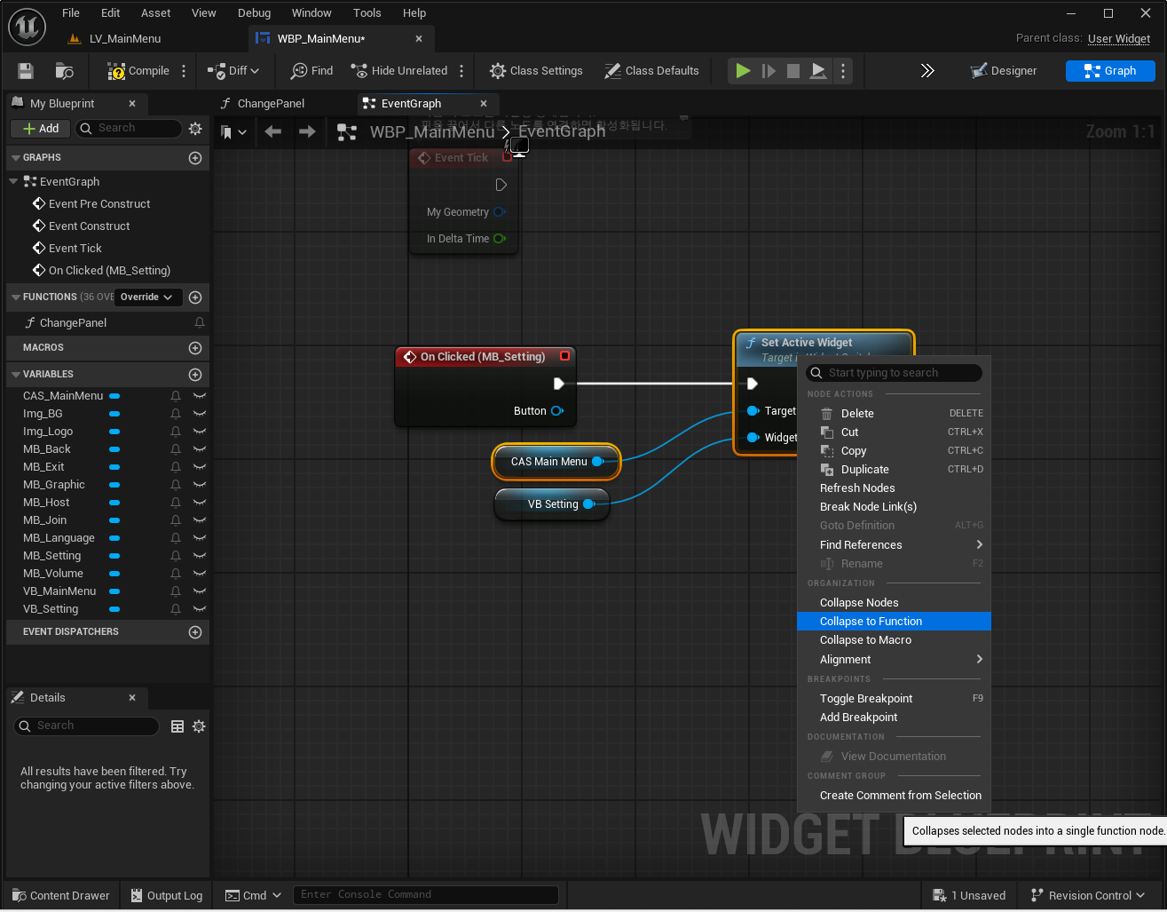 MB_Setting) 클릭OnClicked(MB_Setting) 트리거Set Active Widget 실행CAS_MainMenu (화면 전환 관리자)MB_Setting (보여줄 새 화면)WidgetSwitcher가 현재 표시 중인 화면을 “MB_Setting”으로 교체