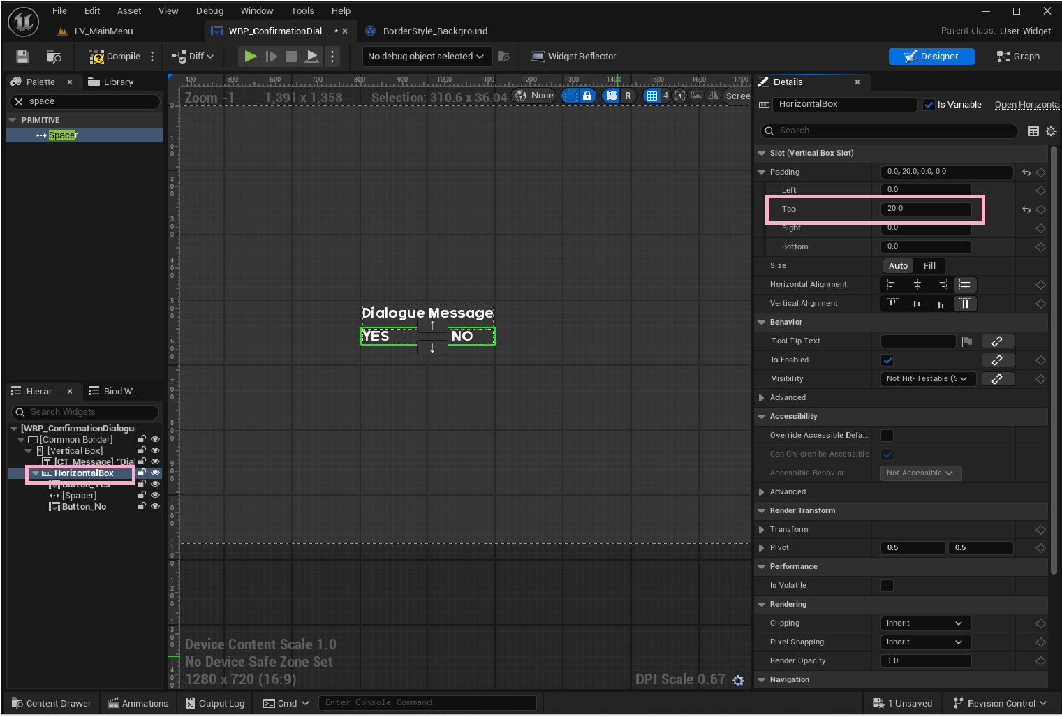 Horizontal Box Top Padding을 20 추가해서 Dialogue Message와 간격 띄우기