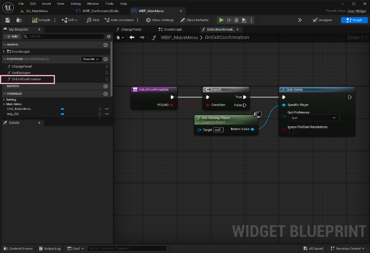 Exit 누르면 WBP_ConfirmationDialogue 위젯 호출