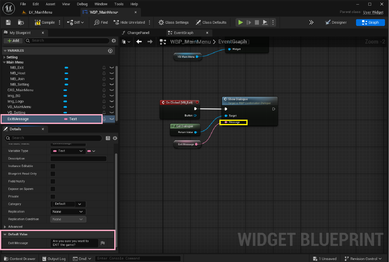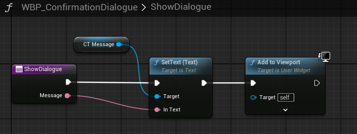 Get DialogueGetDialogue)를 호출해서WBP_ConfirmationDialogue 인스턴스를 가져옴Show DialogueMessage 핀에는 표시할 텍스트 (Exit Message = “Are you sure you want to exit the game?”)가 들어감WBP_ConfirmationDialogue 위젯"확인창 위젯을 불러서 메시지 띄워줘."
