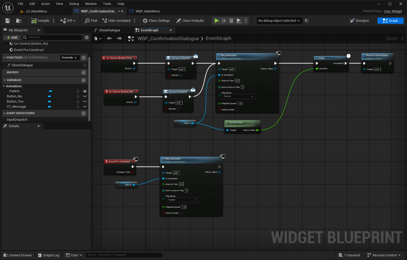 Call Input Dispatch 로 상위(MainMenu)에게 “YES/NO” 신호를 보냄Play Animation (FadeIn, Reverse) 실행 → FadeIn을 역재생해서 “서서히 사라짐(FadeOut)” 효과를 냄GetEndTime → Delay → Remove from Parent 로 애니메이션이 끝난 뒤 위젯을 완전히 제거💡 이게 페이드아웃 타이밍 제어 부분