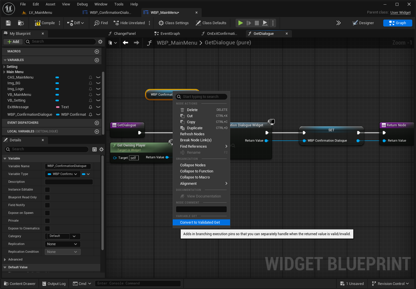 GET — WBP Confirmation Dialogue 변수 확인WBP Confirmation Dialogue 라는 변수는 확인창 (예: “Are you sure you want to exit the game?”) 위젯의 참조를 담는 변수Is Valid 로 “이미 만들어져 있는지”를 검사🔍 의미: ****이미 존재하면 재사용하고, 없으면 새로 만든다.