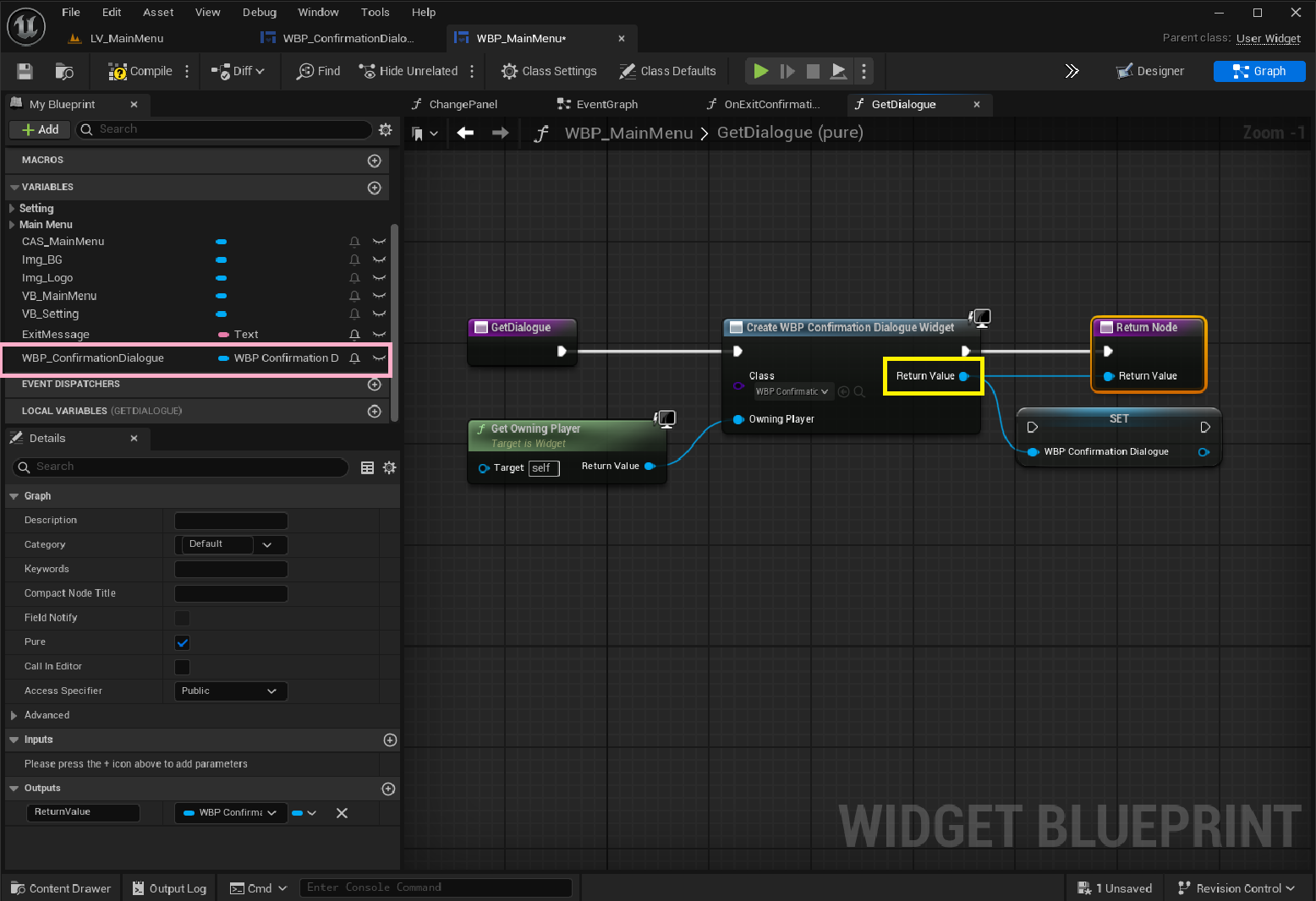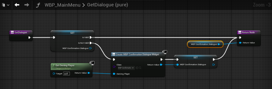 Create WBP Confirmation Dialogue WidgetWBP_ConfirmationDialogue)을 새로 생성하는 노드Get Owning Player 결과를 연결Return Value)가 새로 생성된 위젯 인스턴스가 됨SET — 변수에 저장WBP Confirmation Dialogue 변수에 저장합니다.GetDialogue() 호출 시, 이미 존재하는 동일 인스턴스를 재사용할 수 있습니다.🔍 의미: “다음에 또 필요하면 새로 만들지 말고 이걸 써라.”