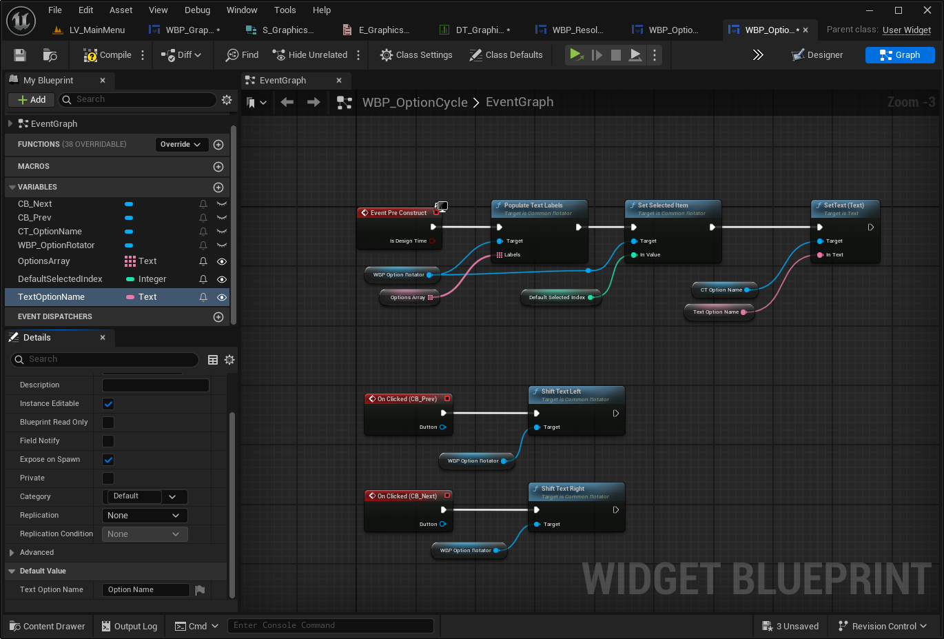 WBP_OptionCycle의 TextOptionName, DafaultSelectedIndex, OptionArray을 Expose on Spawn 체크하기