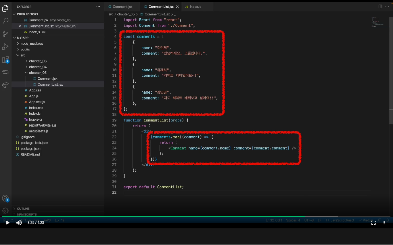 props - 입력으로 들어감 / 유저, 내용 처럼 동적으로 바뀌게 끔 하는 값 {props.name} {props.comment} 속성이라는 뜻 붕어빵에 들어간 재료, 읽을수만 있다 = 값을 변경할수없다