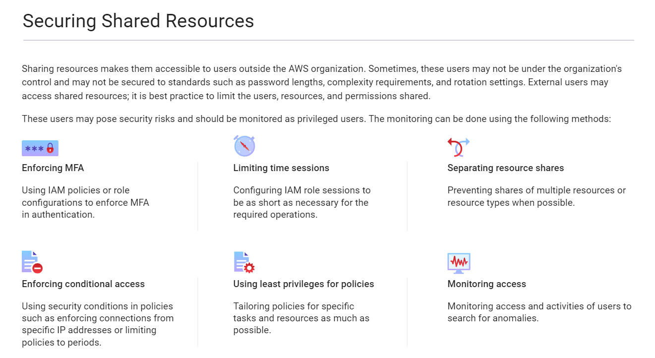리소스를 공유하면 AWS 조직 외부의 사용자에게 접근할 수 있게 된다. 때로는 이러한 사용자가 조직의 관리 범위 내에 있지 않을 수 있으며, 암호 길이, 복잡성 요구 사항 및 회전 설정과 같은 표준에 따라 보안되지 않을 수 있다. 외부 사용자는 공유된 리소스에 접근할 수 있으므로, 사용자를 제한하고 리소스와 권한을 제한하는 것이 모범 사례다.