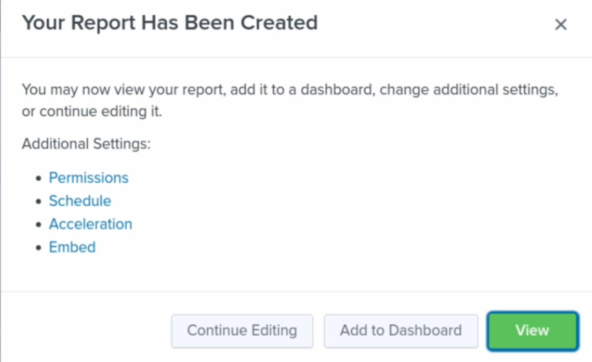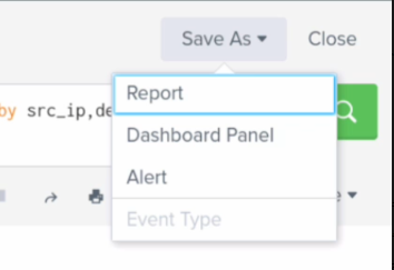 Save As 메뉴에서 Report, Dashboard Panel, Alert 등의 옵션을 선택할 수 있음.