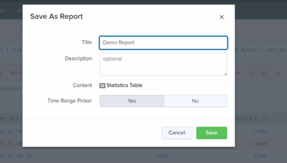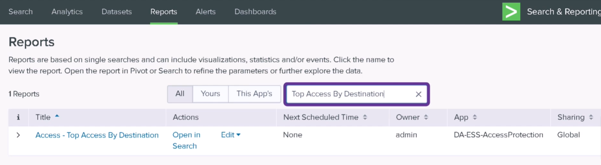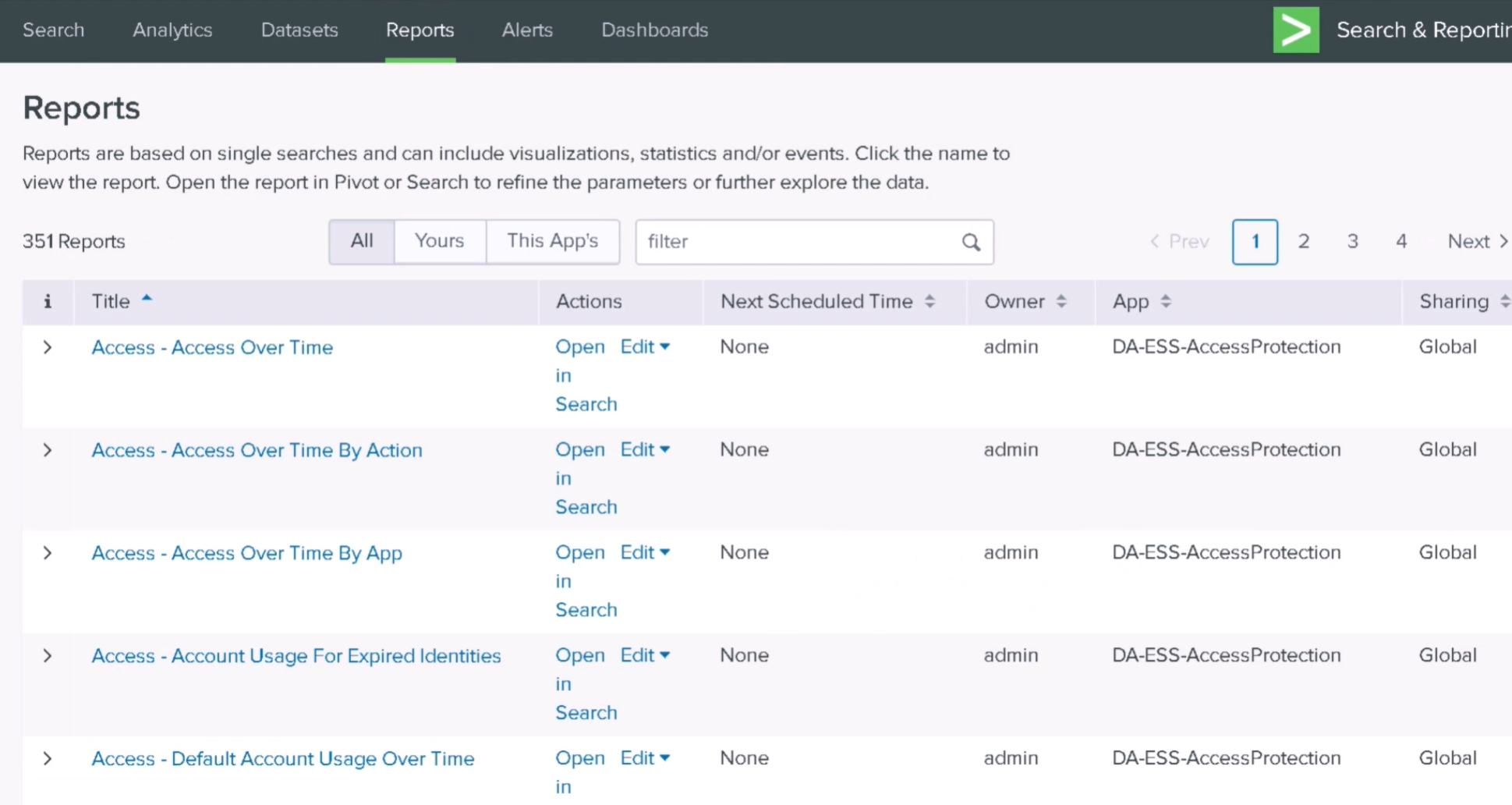 reports는 단일 검색을 기반으로 하며 시각화, 통계 및 이벤트를 포함할 수 있고 보고서를 보려면 이름을 클릭하면된다.