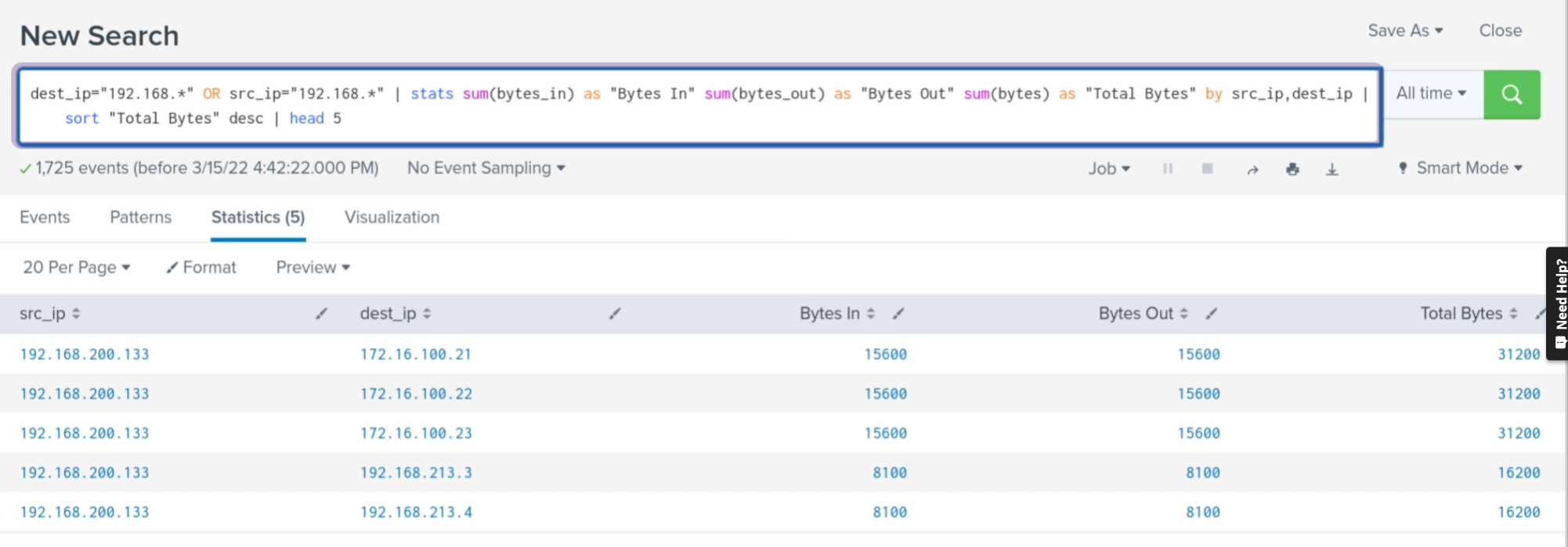 통계 계산: stats 명령어를 사용하여 bytes_in, bytes_out, bytes 필드의 합계를 각각 "Bytes In", "Bytes Out", "Total Bytes"라는 이름으로 계산, 이 계산은 src_ip와 dest_ip별로 그룹화된다.