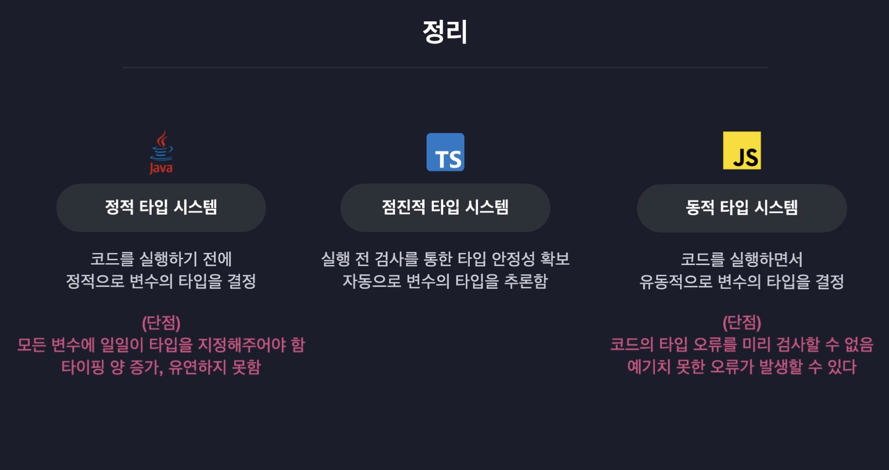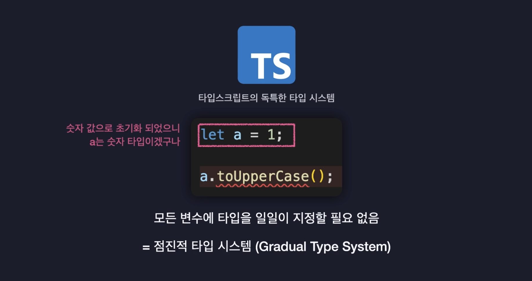 타입스크립트는 동적인 타입 시스템의 안전하지 않은 문제를 해결하면서도 정적인 타입 시스템의 귀찮음도 동시에 해결하는 멋진 타입 시스템이다. 이런 타입스크립트를 점진적 타입 시스템이라고 한다.