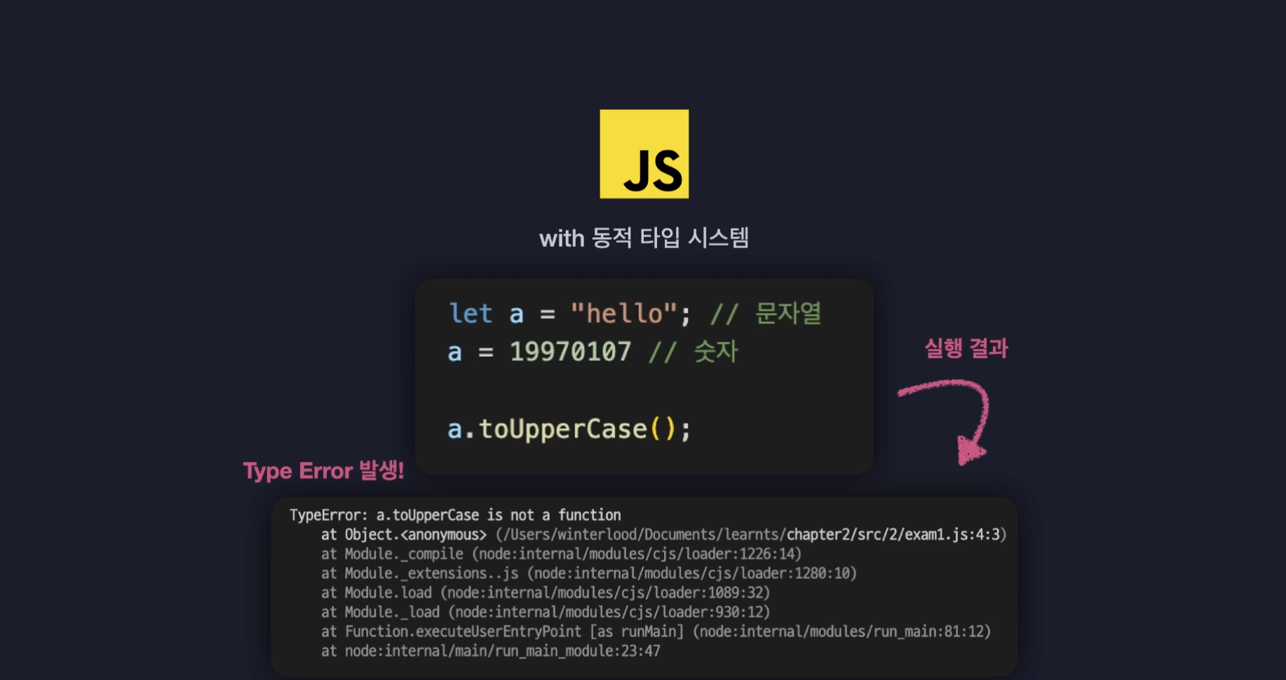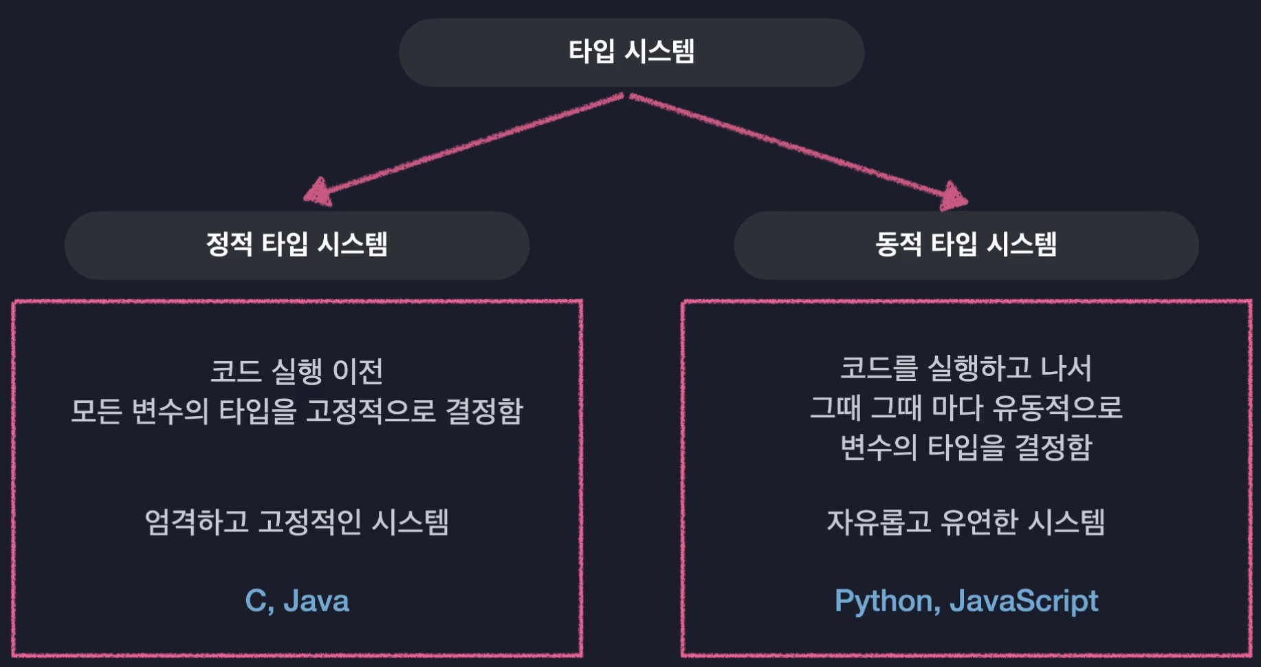 타입 시스템이란? 프로그래밍 언어에서 변수, 표현식 및 함수의 데이터 타입을 정의하고, 이 타입들 간의 관계를 규정하며, 프로그램의 실행 전후에 타입 관련 오류를 예방하고 탐지하는 체계를 말한다.