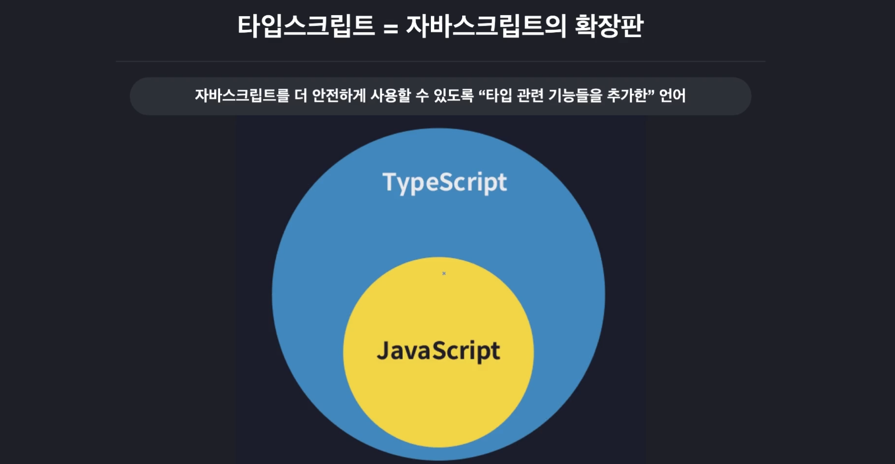 자바스크립트를 더 안전하게 사용할 수 있도록 "타입 관련 기능들을 추가한" 언어 타입스크립트가 개발 되었다.