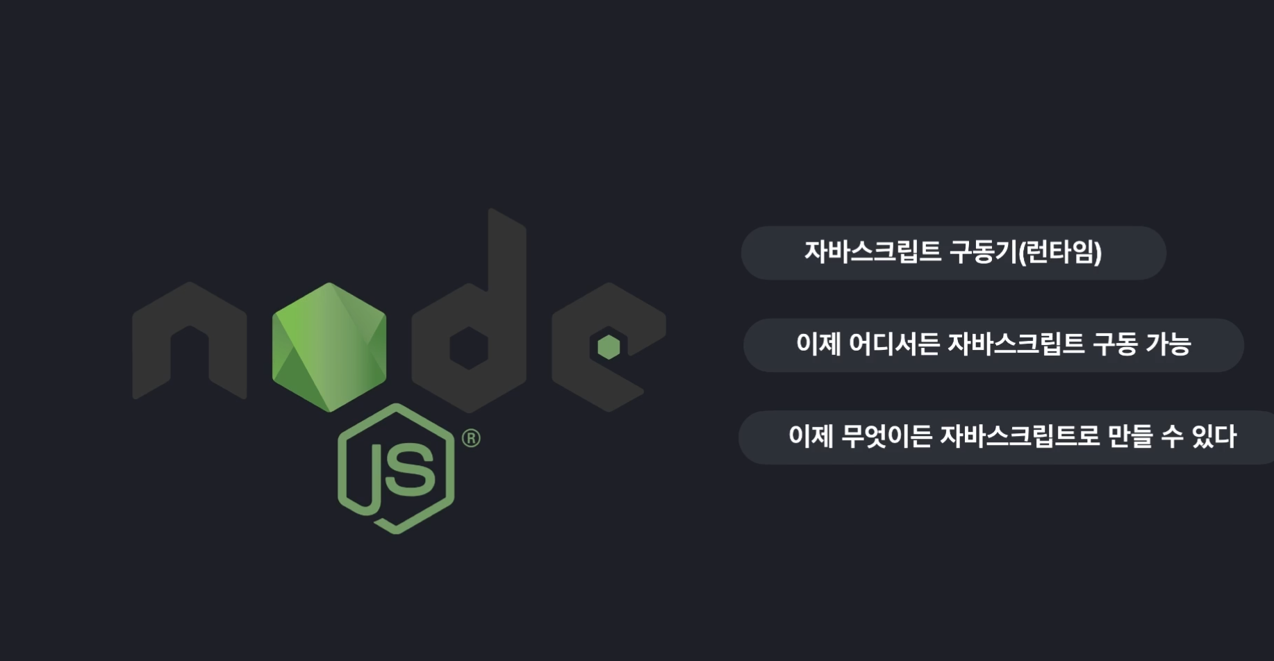 노드 js 탄생 이후에는 웹브라우저에서만 실행될 수 있었던 자바스크립트를 어디서든 실행이 가능해 졌으며 어떤 프로그램이든 자바스크립트를 사용하여 제작이 가능해졌다.