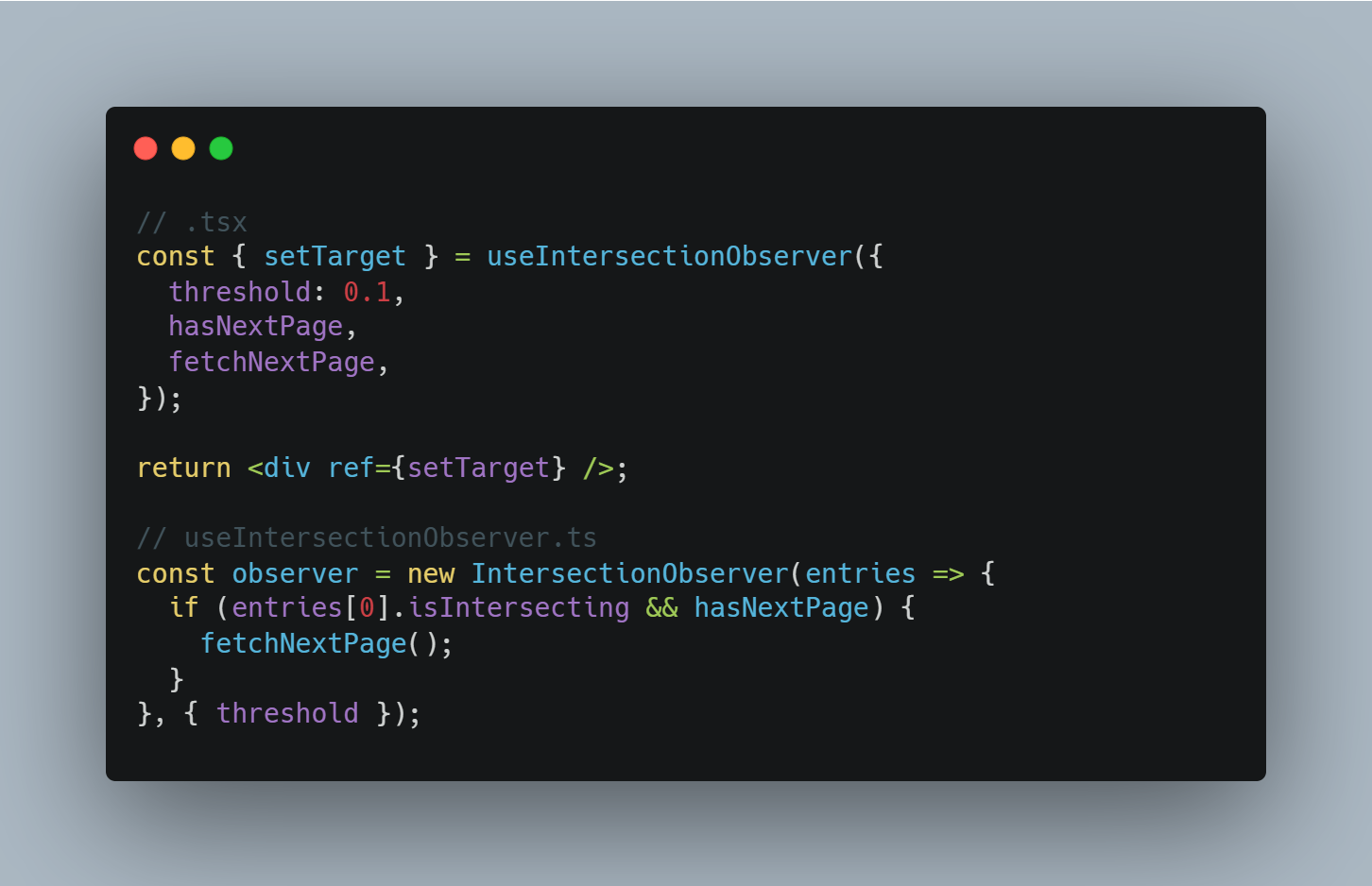 반면 useIntersectionObserver를 커스텀 훅으로 직접 구성하면서는, 관찰 기준, 콜백 처리, 비동기 흐름 제어 등을 내가 원하는 대로 커스터마이징할 수 있었고, 그 과정에서 IntersectionObserver API 자체에 대한 이해도도 깊어졌다.