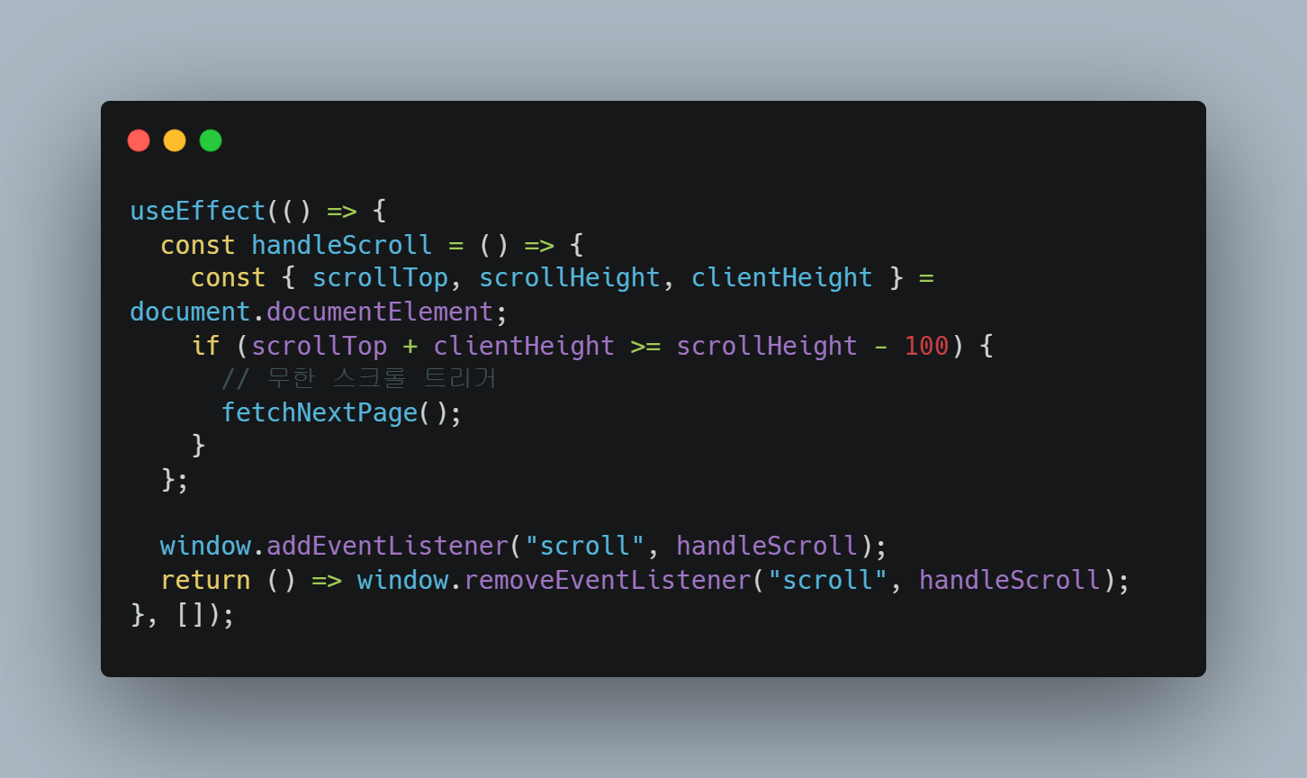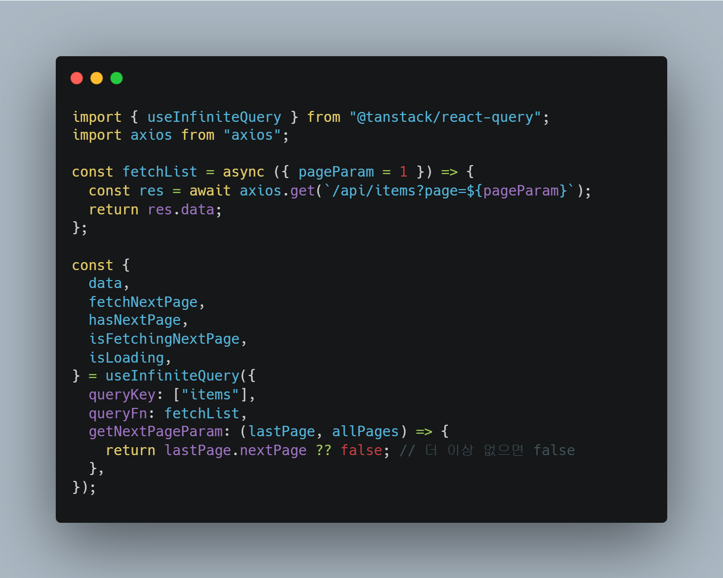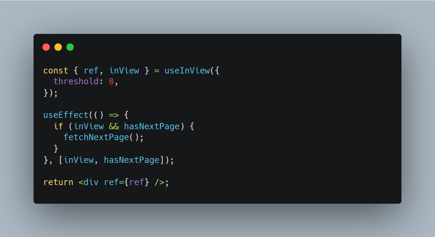 ▪ 스크롤 감지 기능은 포함돼 있지 않음 → 무한 스크롤을 위해선 IntersectionObserver 또는 useInView 등 별도 감지 로직과의 조합이 필요