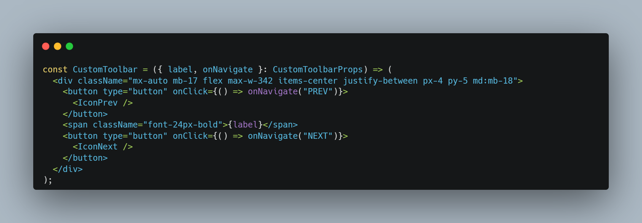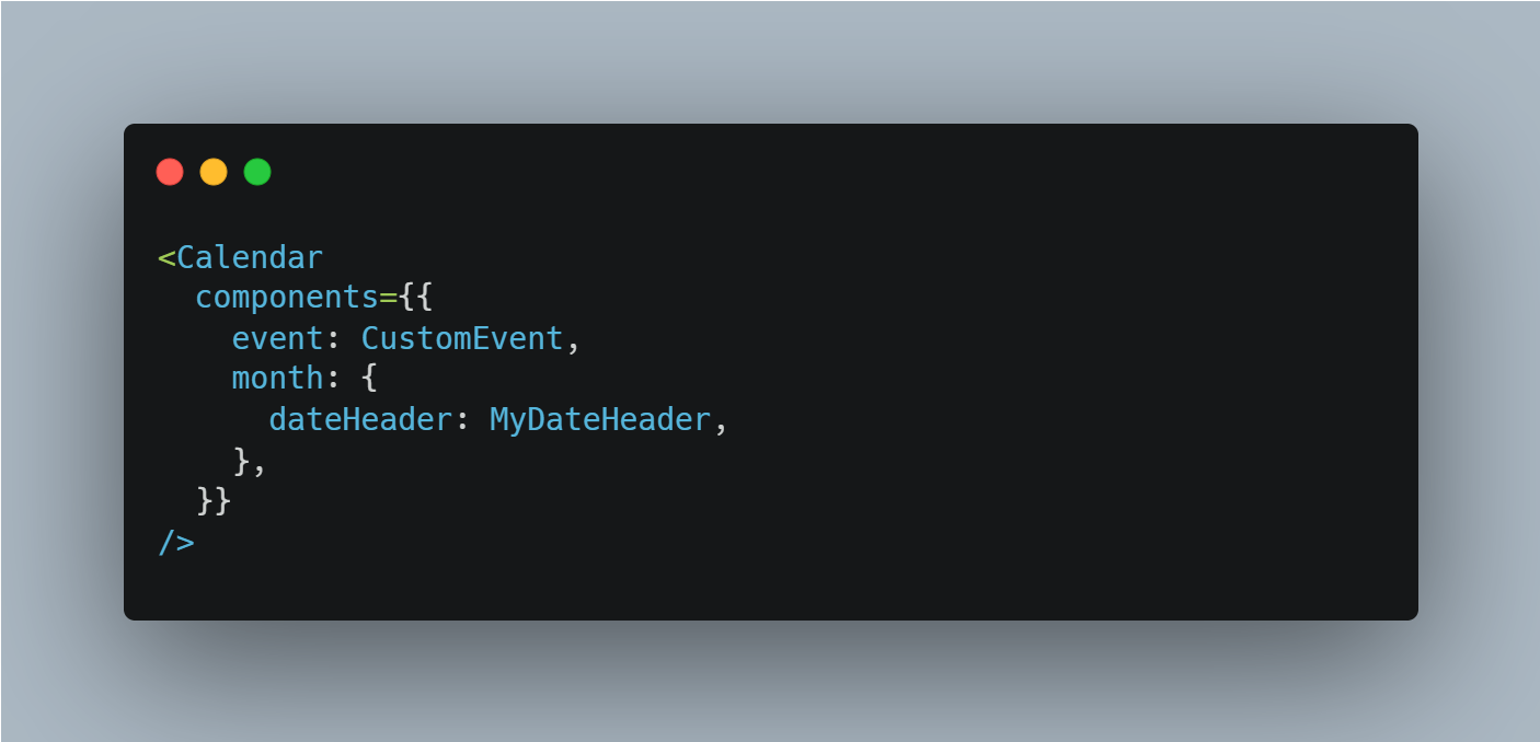 ▪ react-big-calendar는 components prop을 통해 각 UI 부분을 커스터마이징할 수 있도록 되어 있어서, 아래와 같이 CustomToolbar, CustomEvent, dateHeader 등을 직접 정의해 대체