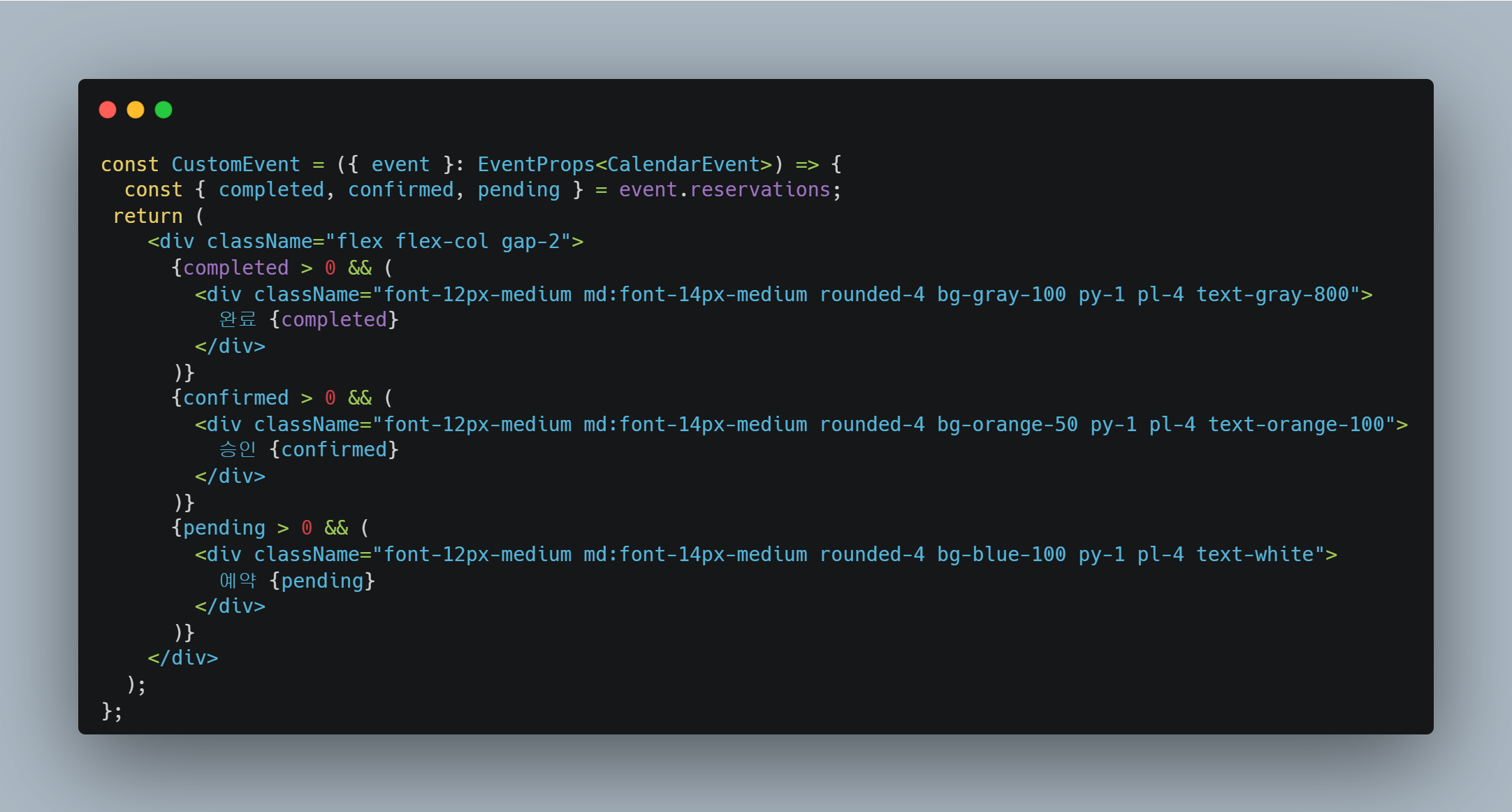 이렇게 각 이벤트에 대해 시각적으로 구분된 정보를 제공하여 예약 현황 파악을 쉽게 했다.
