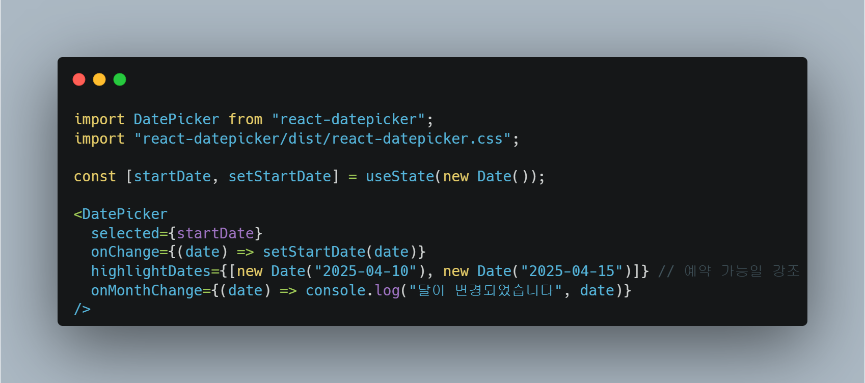 | 📌 날짜 필터링 | 특정 날짜만 선택 가능하도록 제약 가능 (예: 예약 가능한 날짜만 표시) |