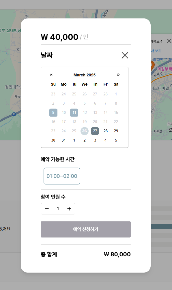 체험 예약 기능에서 핵심이 되는 요소 중 하나는 날짜 선택 UI다. 사용자는 본인이 원하는 날짜를 명확하게 선택할 수 있어야 하며, 예약 가능한 날짜와 불가능한 날짜를 구분할 수 있어야 한다. 이를 위해 처음에는 단순한 input type="date"를 고려했으나, 다음과 같은 한계가 있었다