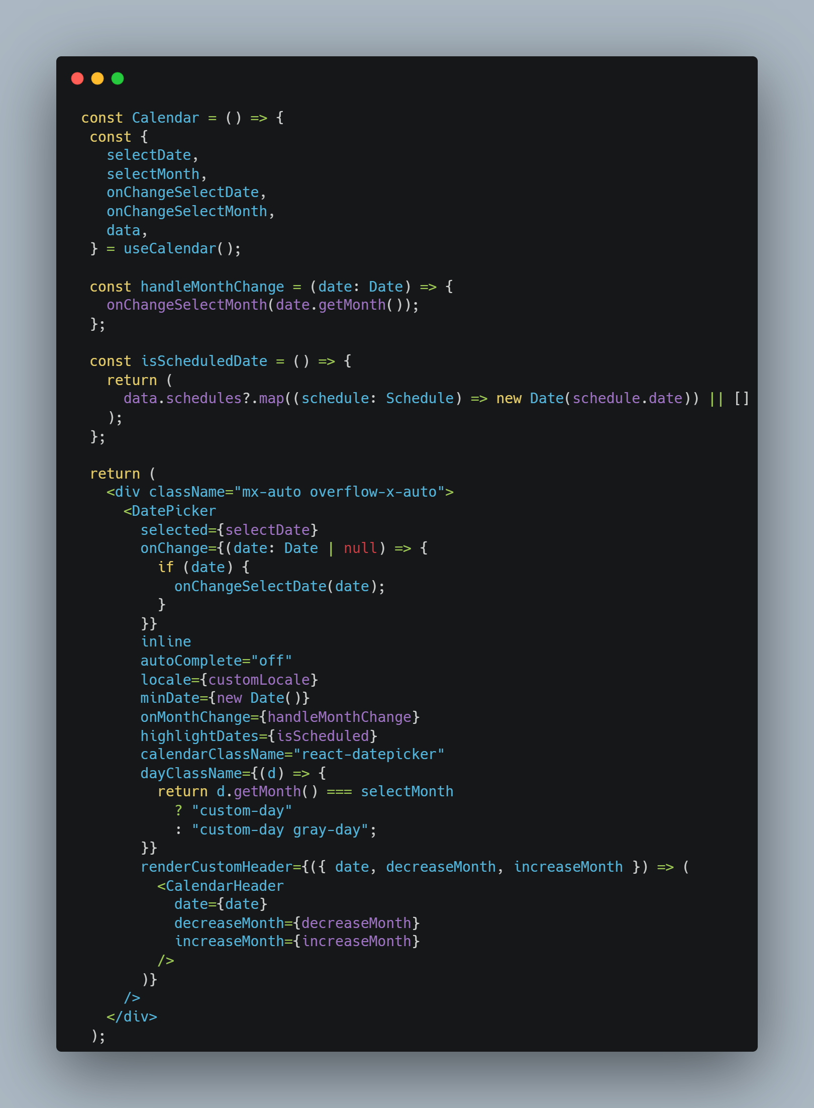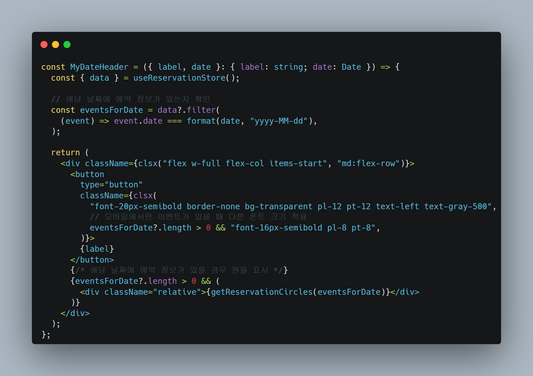 결국 커스텀 컴포넌트 렌더링(components, renderHeader, dayClassName 등)을 적극 활용하며 라이브러리를 우리 UI 설계에 맞게 가져오는 방식으로 해결해야 했다. 이 과정에서 단순 사용자가 아닌, 라이브러리를 통제하는 설계자로서의 시야를 확장할 수 있었다.