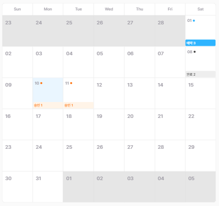 날짜만 선택할 수 있었던 기존의 datepicker 방식은 전체 일정을 파악하는 데 한계가 있었고, 특히 날짜별 예약 수나 상태를 확인하기엔 부적합했다.(예약 상태에 따른 이벤트 처리) react-datepicker 대신 react-big-calendar를 도입하여 월간 단위의 예약 현황을 시각적으로 한눈에 확인할 수 있는 UI를 구성했다.
