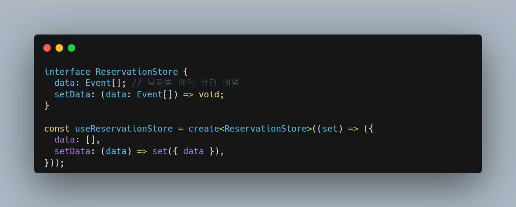 사용자가 날짜를 선택하거나 상세 예약 정보를 확인하는 흐름은 단순한 UI 상호작용을 넘어 다양한 상태와 비동기 데이터의 흐름이 얽혀 있는 구조다. 이를 보다 일관성 있게 관리하기 위해, Zustand사용했다.