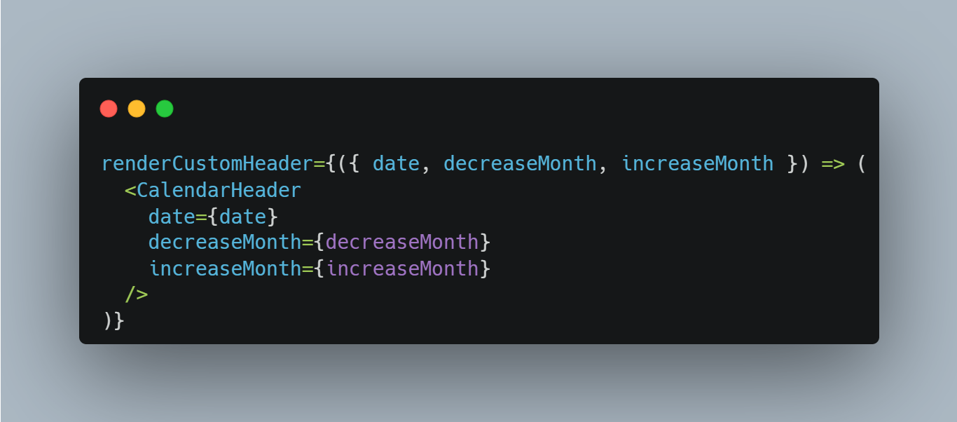기본 캘린더 헤더 대신 커스텀 컴포넌트로 교체 → 좌우 버튼, 월/년 표시 디자인 자유롭게 구현 가능