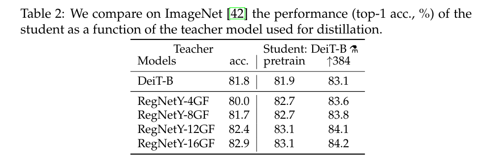 이후의 모든 증류 실험에서 기본 교사는 DeiT와 동일한 데이터 및 동일한 데이터 증강으로 훈련한 RegNetY-16GF [40](84M 매개 변수)이다.