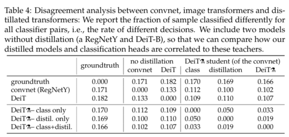 이 질문에 정식으로 답하기 어렵다고 생각하지만 표 4에서 convnet 교사, 레이블에서만 학습한 이미지 변환기 DeiT 및 변환기 DeiT⚗ 간의 결정 일치를 분석합니다.