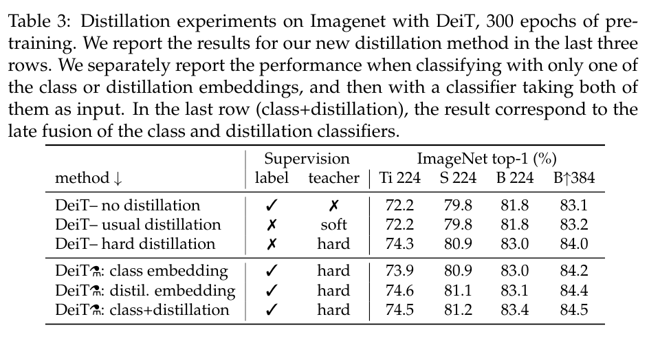 클래스 또는 증류 임베딩 중 하나만 사용하여 분류할 때 성능을 별도로 보고한 다음 두 분류자가 둘 다 입력으로 사용합니다.