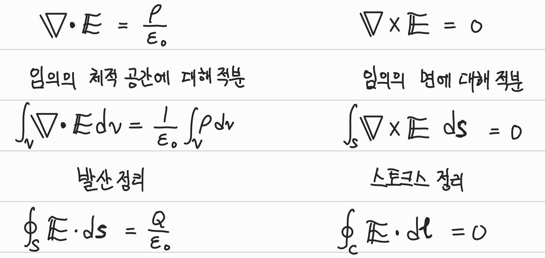 물리적인 의미: 자유공간 내 임의의 닫힌 공간에서 외부로 발산되는 모든 전기장의 세기의 합은 그 공간 내부의 총 전하량을 유전상수로 나눈 값과 같다.