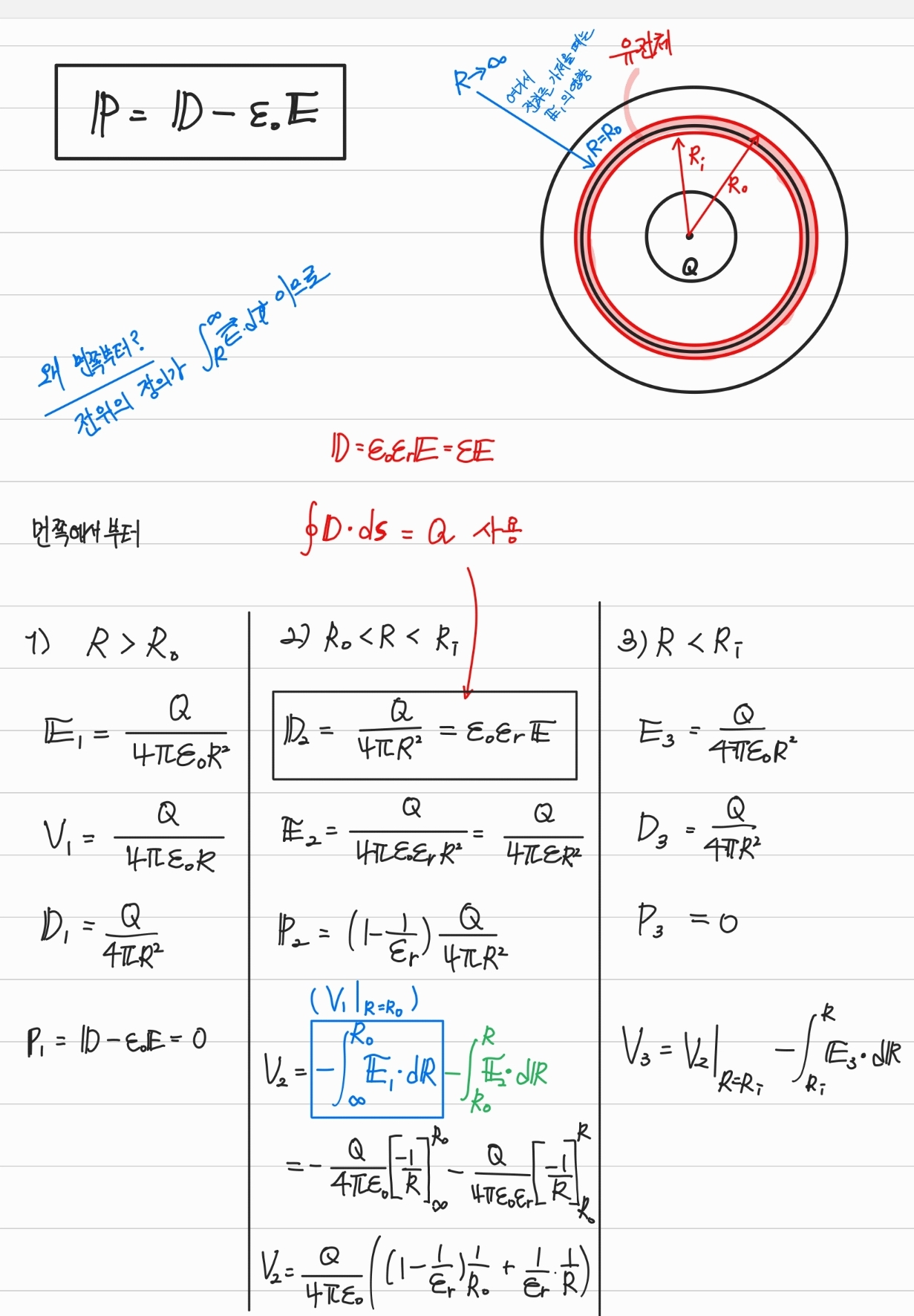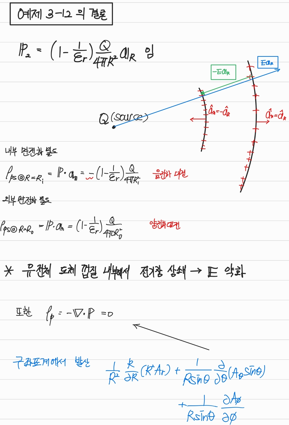 - 유전체의 면전하밀도를 계산해보면 안쪽에는 음전하가 바깥쪽은 양전하가 대전됨을 알 수 있다.