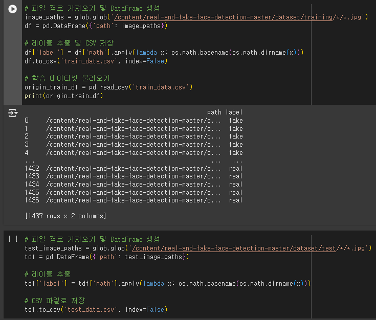 glob 메서드로 training / test 파일 경로를 df로 만들고, 파일명으로 labeling 진행했습니다.
