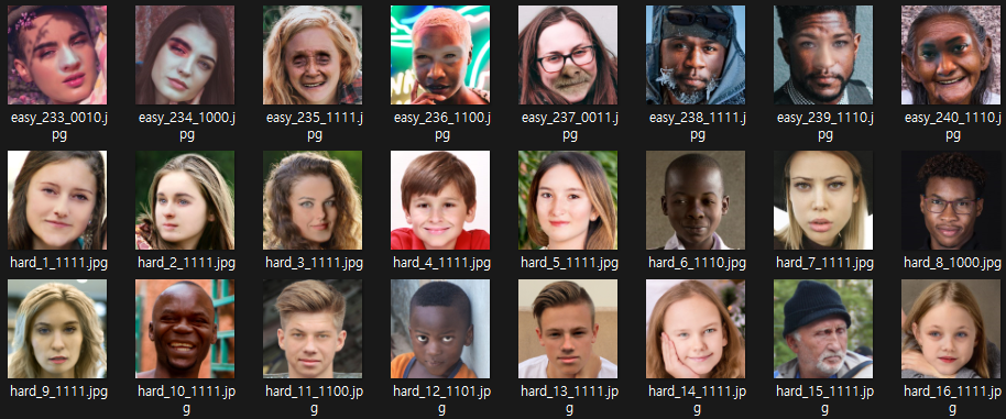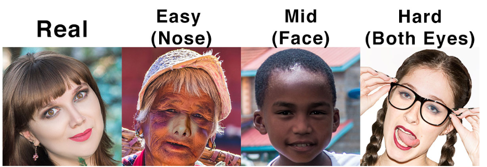 fake imgae는 easy / mid / hard 의 세가지 분류가 있습니다. (easy는 합성된 이상한 이미지, hard는 실제 사람과 분간이 힘든정도)