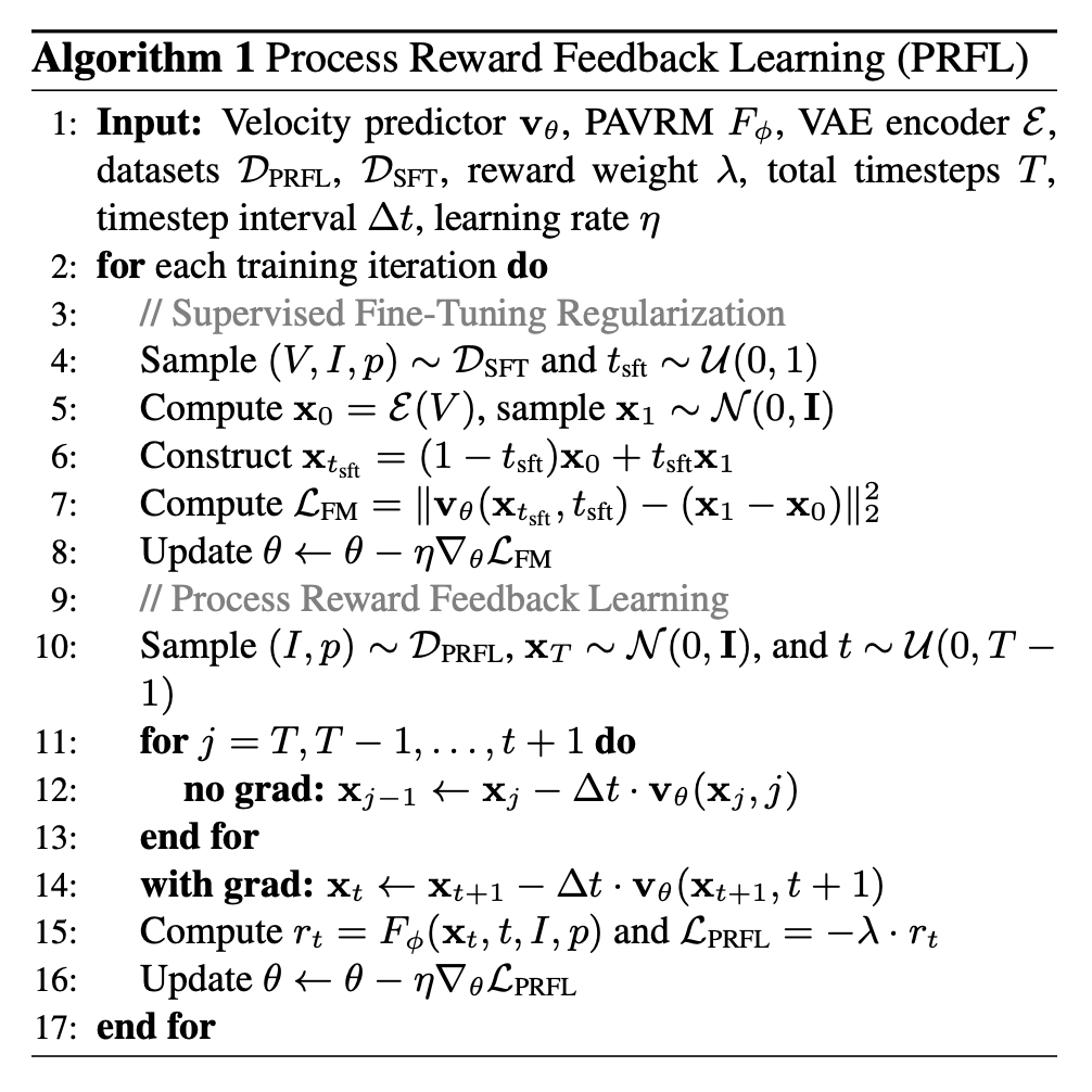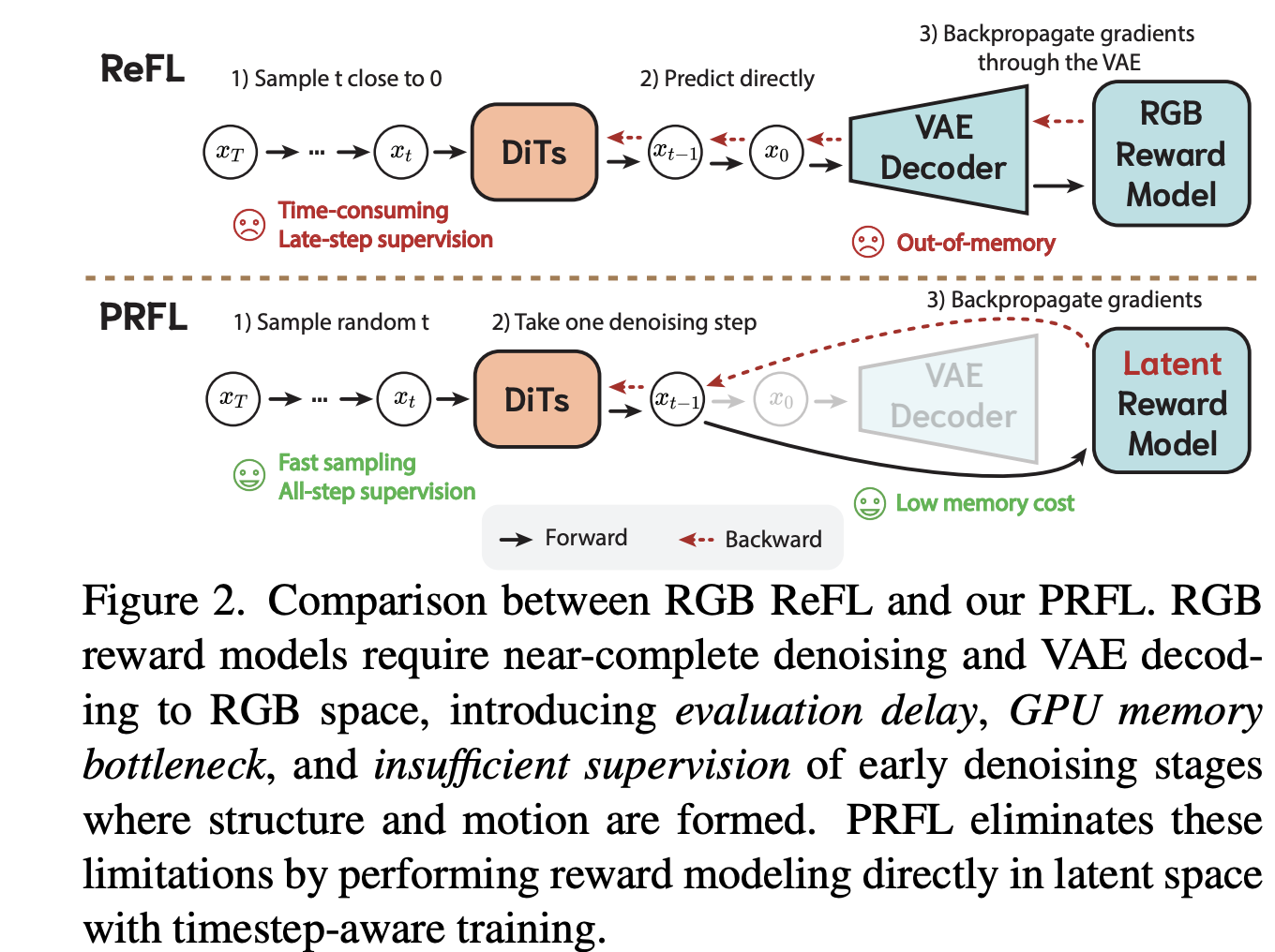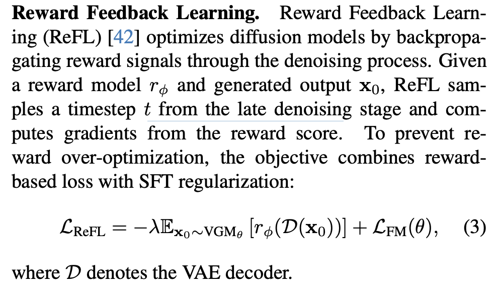 기존의 ReFL은 리워드를(RLHF) 완성된 이미지를 보고 주기 때문에 디퓨전 후반에만 관여할 수 있었다. 해당 모델은 latent 단계에서 이를 주어 정확도를 높이는 전략을 취한다고 한다. 일단 리워드를 기존에 주는 방법은 다음과 같다.