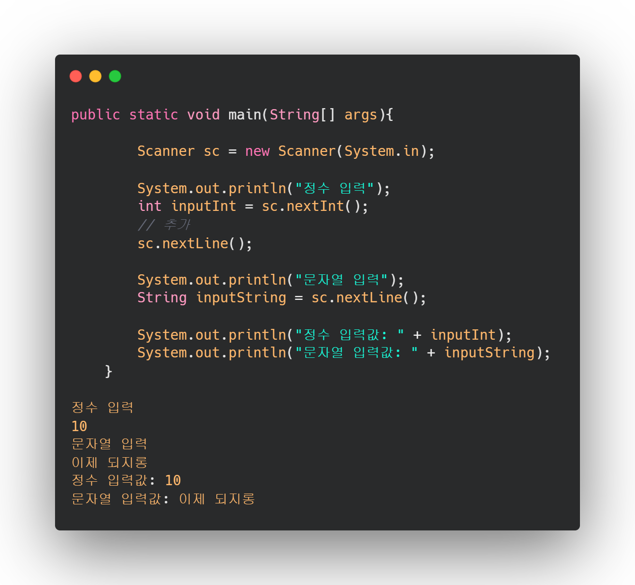 정수를 입력받은 후 nextLine()을 호출해 추가적으로 한 줄을 읽어 개행 문자를 소비한다.