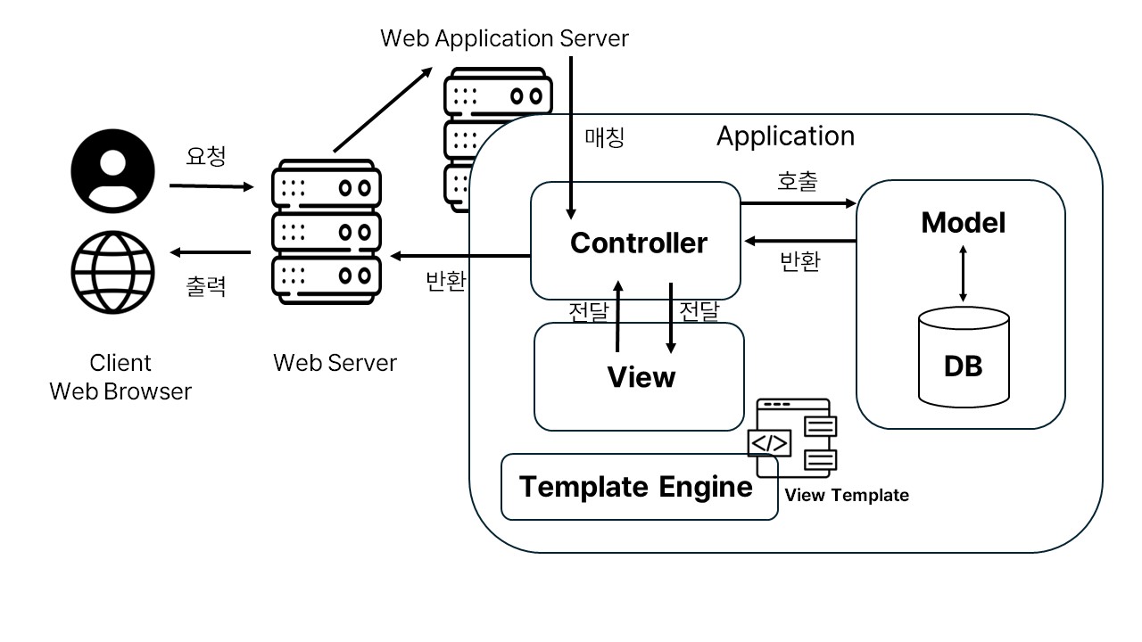 데이터베이스에서 Model(데이터)를 조회하여 그걸 기반으로 View(웹 페이지)를 만들어 Controller가 반환한다.
