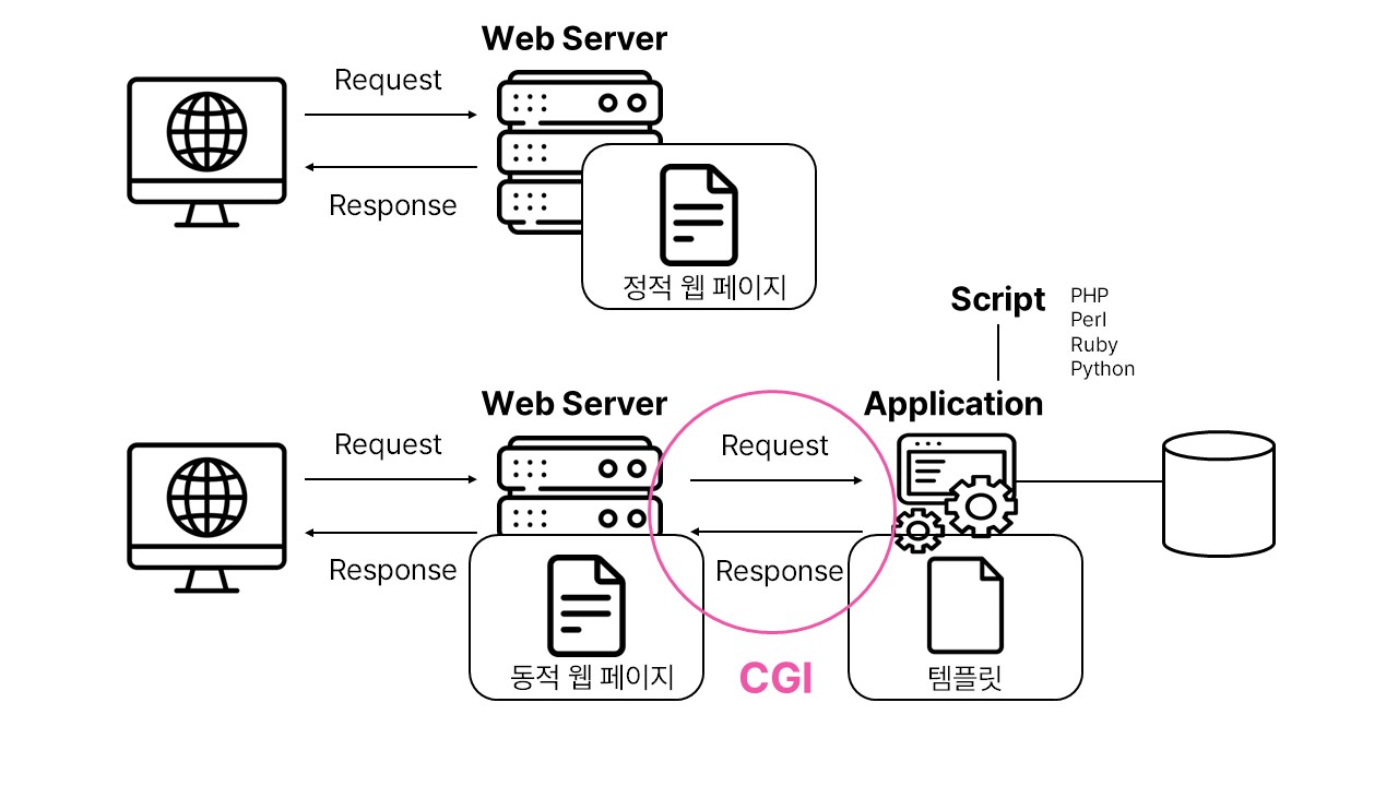 이때 웹 서버가 요청을 받아 어플리케이션을 실행하고, 페이지 생성을 요청하기 위한 연결고리가 CGI다.