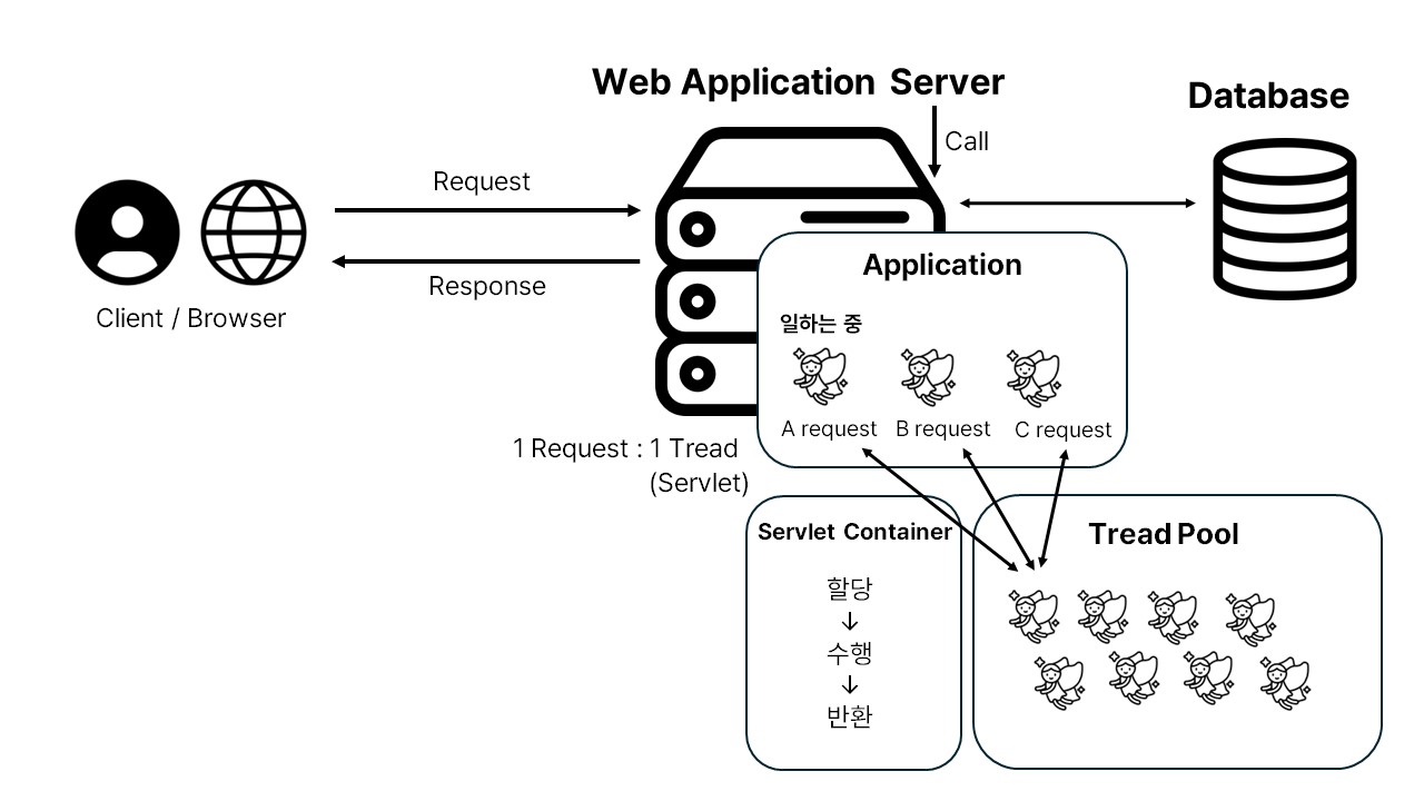 스레드 풀(Thread Pool)에 개수를 지정해 미리 만들어놓고1요청 : 1스레드의 관계를 가진다.