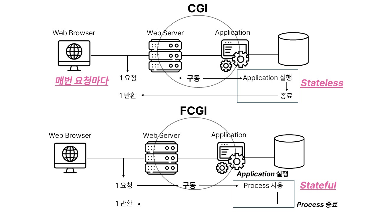 CGI와FCGI는 웹 서버와 서버 사이드 어플리케이션 간의 인터페이스를 정의하는 기술이다.
