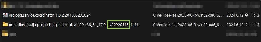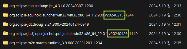 eclipse\plugins 확인해보니, 보통 같으면 설치하거나 upgrade 시마다 해당 폴더명 뒷부분에 버전 관련 최근 날짜도 함께 보였다. ↓