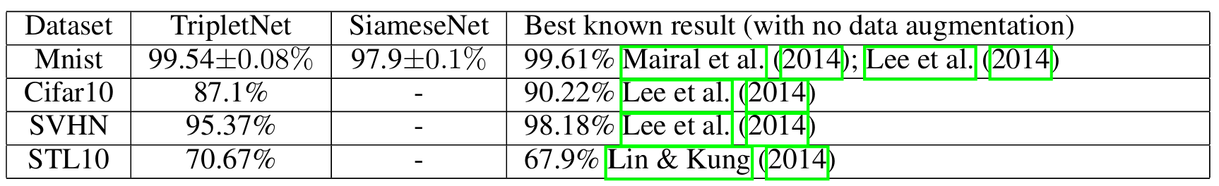 본 논문에서는 Triplet Network 모델을 제안하였다. 이 모델은 딥러닝 신경망을 이용한 embedding을 직접적으로 학습하도록 설계되었다. 여러 데이터셋에 대한 실험 결과, 본 모델이 학습한 표현은 전통적인 분류용 네트워크가 학습한 표현과 동등한 수준으로 분류 작업에 효과적임을 보여준다.