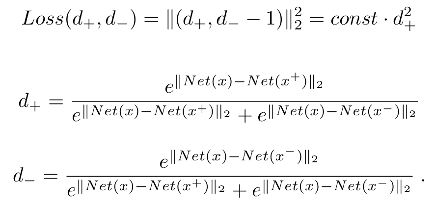 'x와 더 가까운 쪽이 어느 샘플인가?' 를 맞히는 문제로 보면, 네트워크 전체를 이진 분류기처럼 다룰 수 있다. 두 거리에 Softmax를 씌워 d+, d− (가까울수록 1에 가까운 확률)로 변환한다.